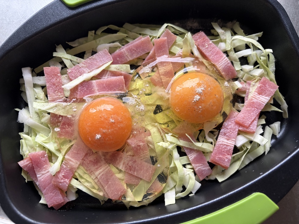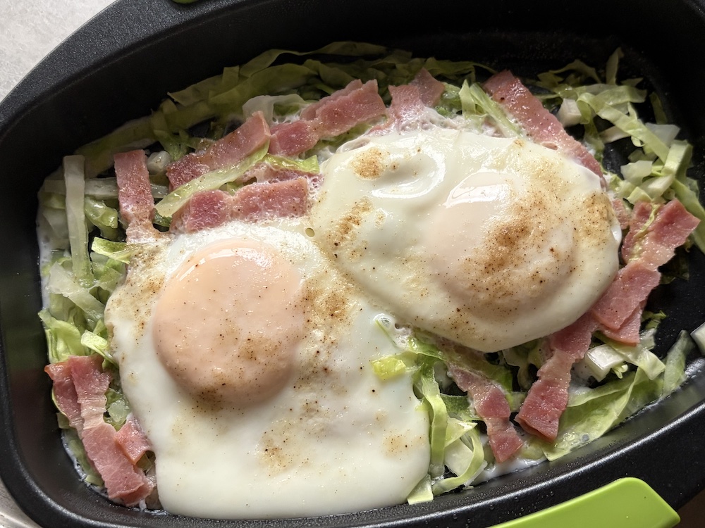 後日、刻みキャベツと刻みベーコンで作った目玉焼きがこちらね。